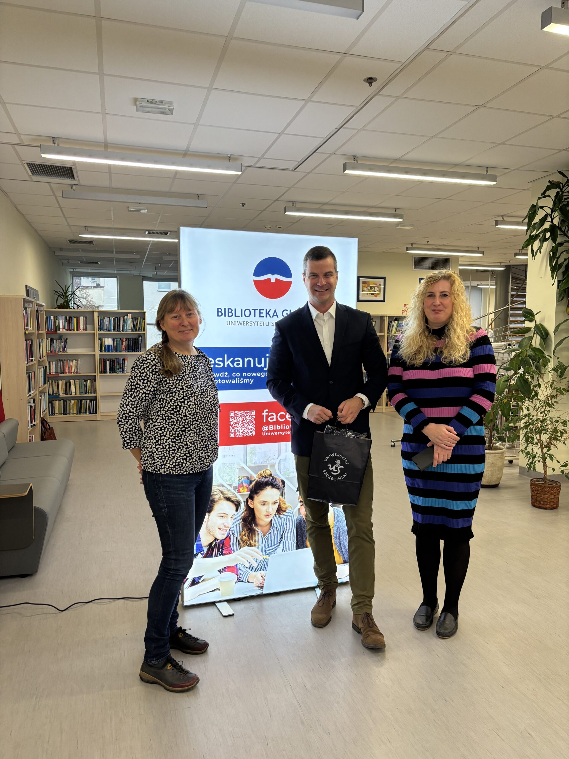 Pan dr Konrad Kochański odbiera w Dziale Udostępniania Biblioteki Głównej gadżety uniwersyteckie jako autor 9 tysięcznej publikacji w Repozytorium Publikacji i Bibliotece Cyfrowej US w towarzystwie Anny Nowak opiekunki Repozytorium i prof. dr hab. Anny Cedro pełnomocnika Rektora ds. otwartego dostępu do publikacji naukowych i danych badawczych.